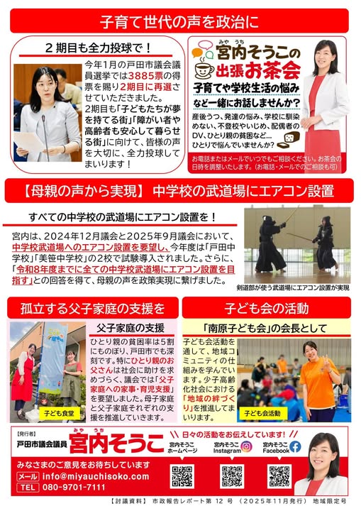 戸田市議会全体の広報誌「とだ議会だより」とは役割が異なり、この個人レポートは、私の目線で市政の現状や課題、前進した取り組みについて率直にお伝えするものです。個人レポートを通じて、市民の皆さまと情報を共有し、市民の皆さんとの交流のきっかけとし、一緒により良い未来をつくっていきたいと考えています。