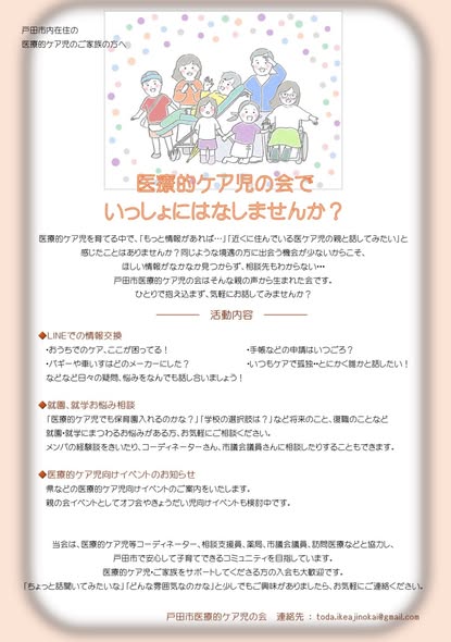 このたび、「戸田市 医療的ケア児の家族会」のチラシが完成しました!