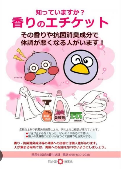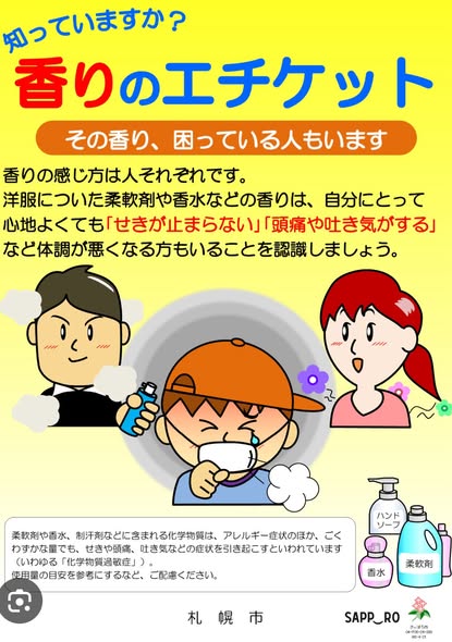 また全国でもこの動きは加速しており、世田谷区や札幌市ではポスター掲示や学校での啓発が行われており、国会議員も洗剤や柔軟剤について取り上げており、国の5省庁も「その香り、困っている人もいます」という啓発ポスターを作成しました。