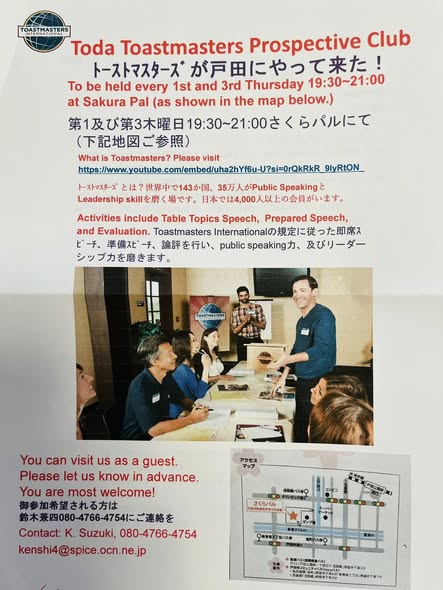 さてこのたび、戸田市在住の鈴木兼四さんを中心とする市民の方々が「戸田トーストマスターズクラブ」を新たに立ち上げることとなりました。