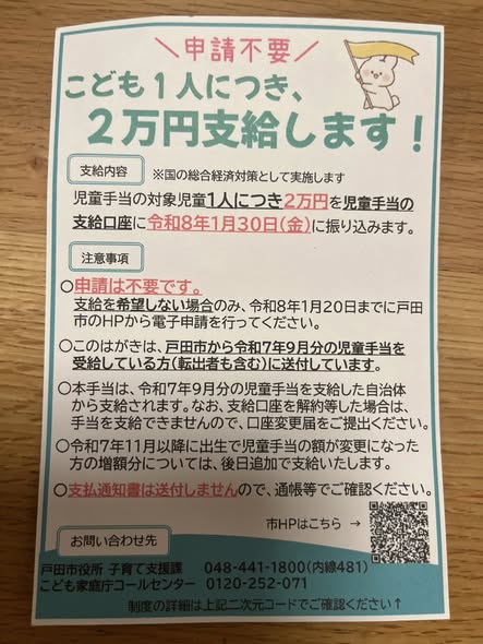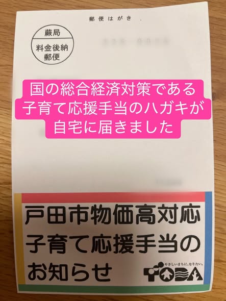 また先日は、「戸田市物価高騰子育て応援手当」のお知らせのはがきが自宅に届きました。