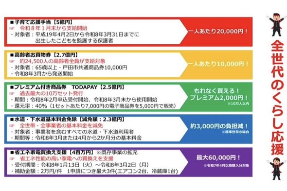戸田市では子育て世帯への支援だけでなく、物価高の影響を受けている市民の皆さんの暮らしを支えるため、昨年12月議会において、さまざまな支援策が議決されました。