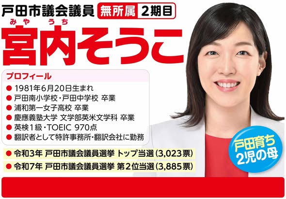 こんにちは、戸田市議会議員の宮内そうこですこのたび市政報告レポートのデザインを一新しました。2期目の活動が始まり早いもので9ヶ月が経とうとしています。この期間、議会活動をはじめ、子ども会会長としての初挑戦や、子ども食堂などの地域活動、委員会活動、市民の皆さまか